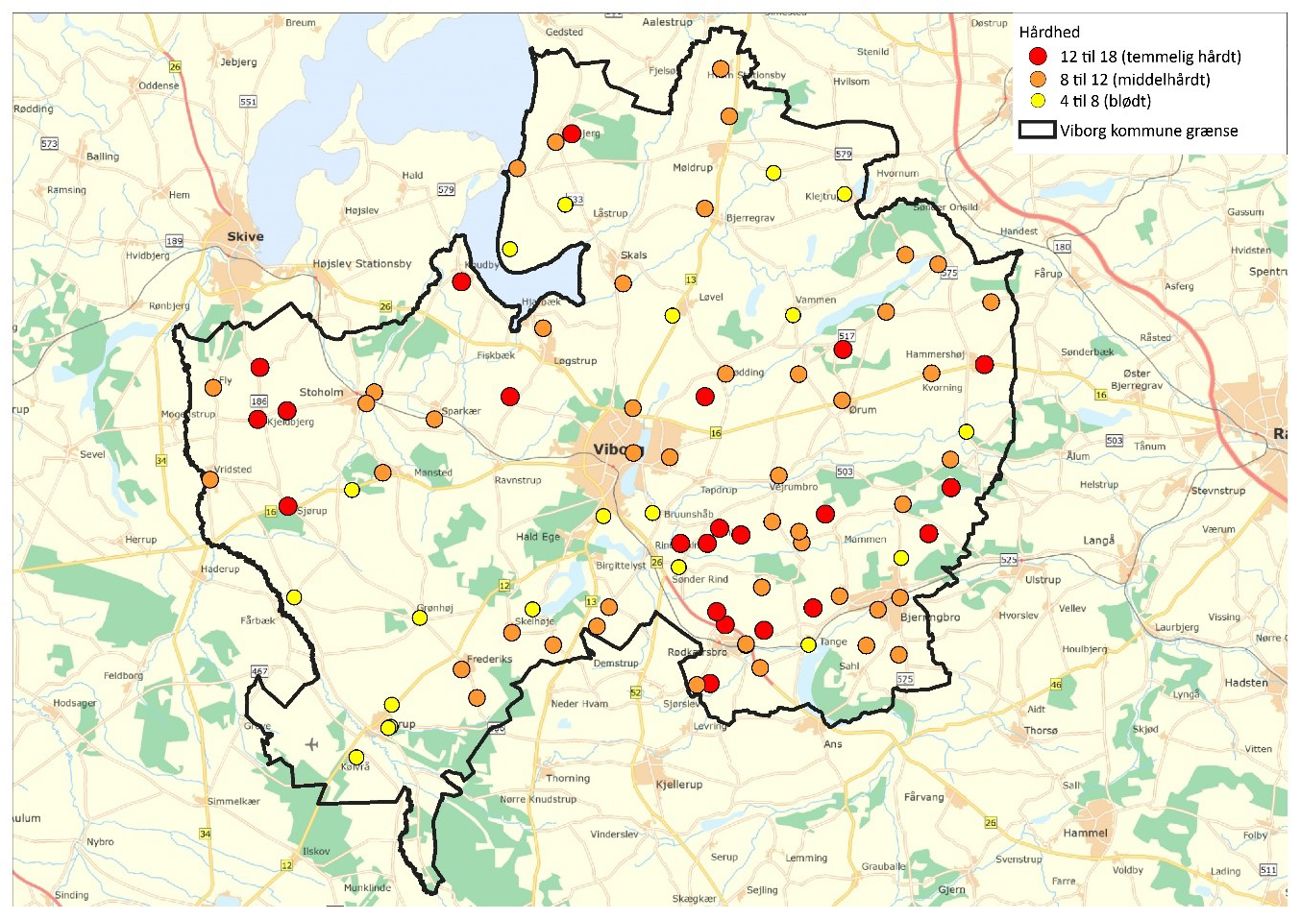 Som eksempel på lokal variation i vandets hårdhed kan nævnes forskellen imellem de 2 vandværker tilhørende Energi Viborg, Syd Værket og Nordværket: Syd Værket indvinder grundvand fra Viborg Hedeplantage, som er domineret af sand, og her er vandet blødt (4-8). For Nordværket, som ligger i Neckelmanns Plantage, indeholder undergrunden mere ler, hvilket giver vandet en større hårdhed.
