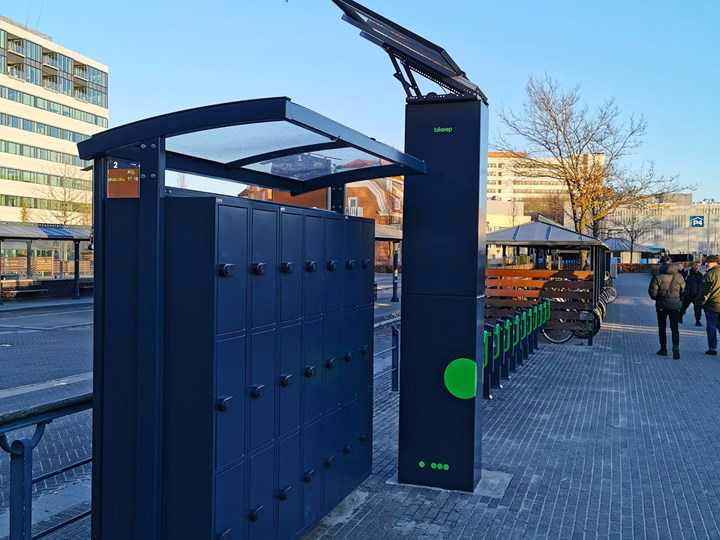 Tyverisikker cykelparkering med mulighed for at oplade el-cykel og bruge en bagageboks til cykelhjelm, batteri m.m. Alt er gratis at bruge.