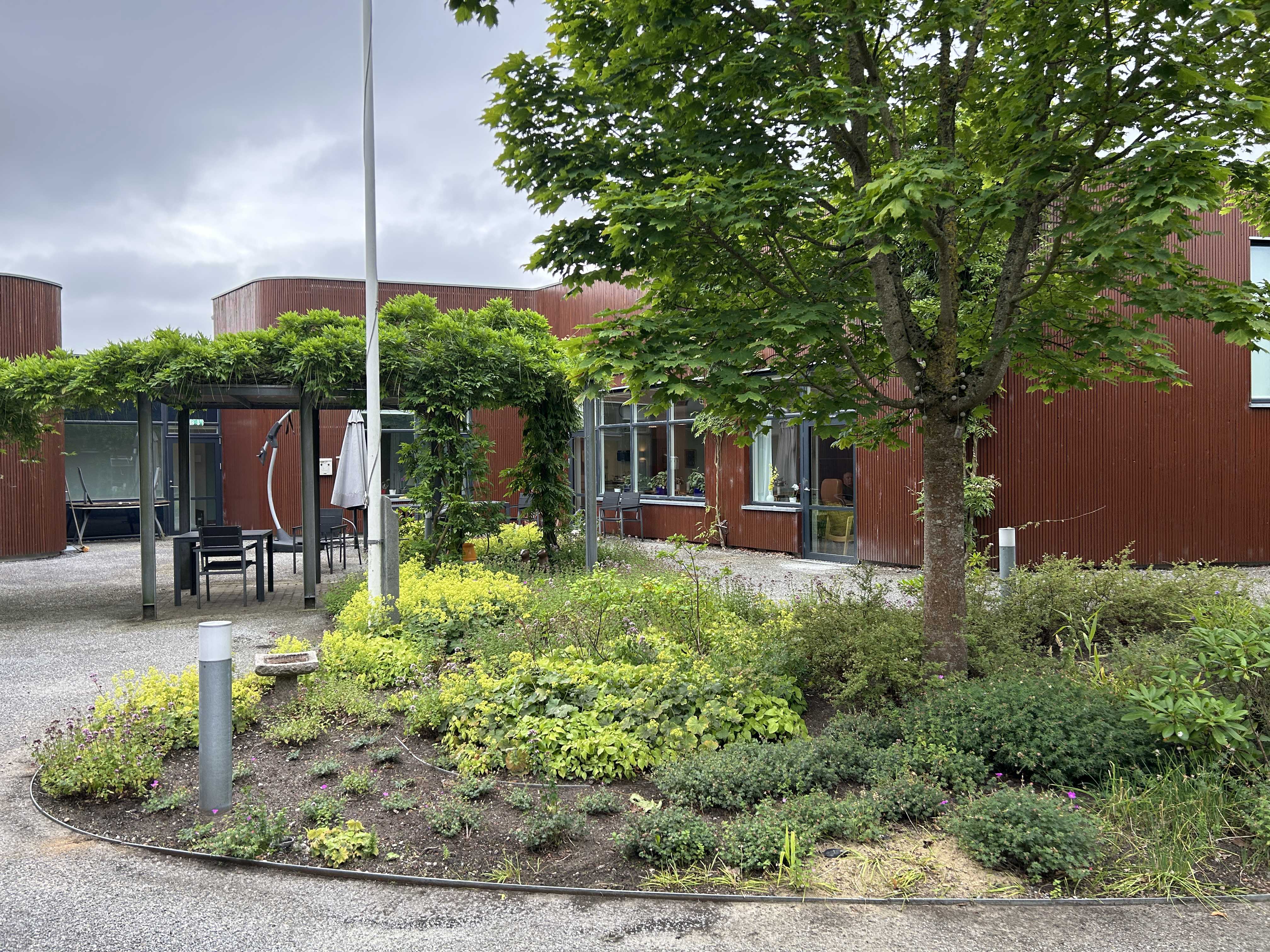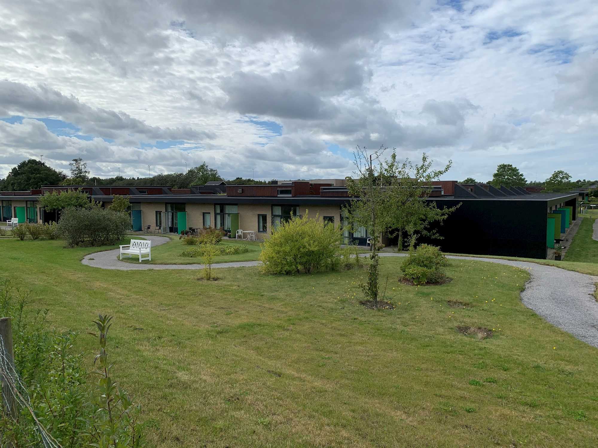 Hovedbygningen er bygget omkring en åben motionsgård og rummer bl.a. kontorer, café, medierum og to gæsteboliger for pårørende. Udenfor findes gårdhavemiljøer, campingvogn, drivhus, petanquebane og meget mere.