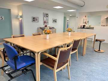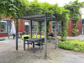 Hovedbygningen er bygget omkring en åben motionsgård og rummer bl.a. kontorer, café, medierum og to gæsteboliger for pårørende. Udenfor findes gårdhavemiljøer, campingvogn, drivhus, petanquebane og meget mere.