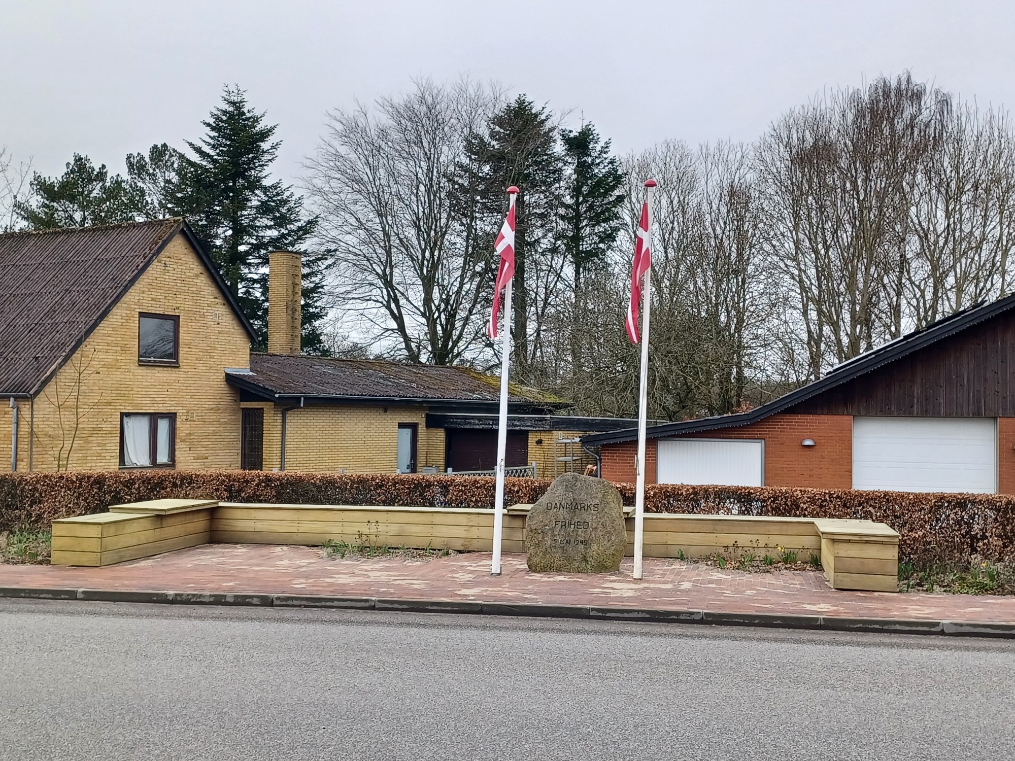Nye teglfliser på fortovene og belægningsskift på vejen fra Femvejskrydset til stien og OK-tanken. Teglfliserne refererer til tidligere teglværker, og betonfladerne bygger videre på belægningerne ved Mønsted Kalkgruber.