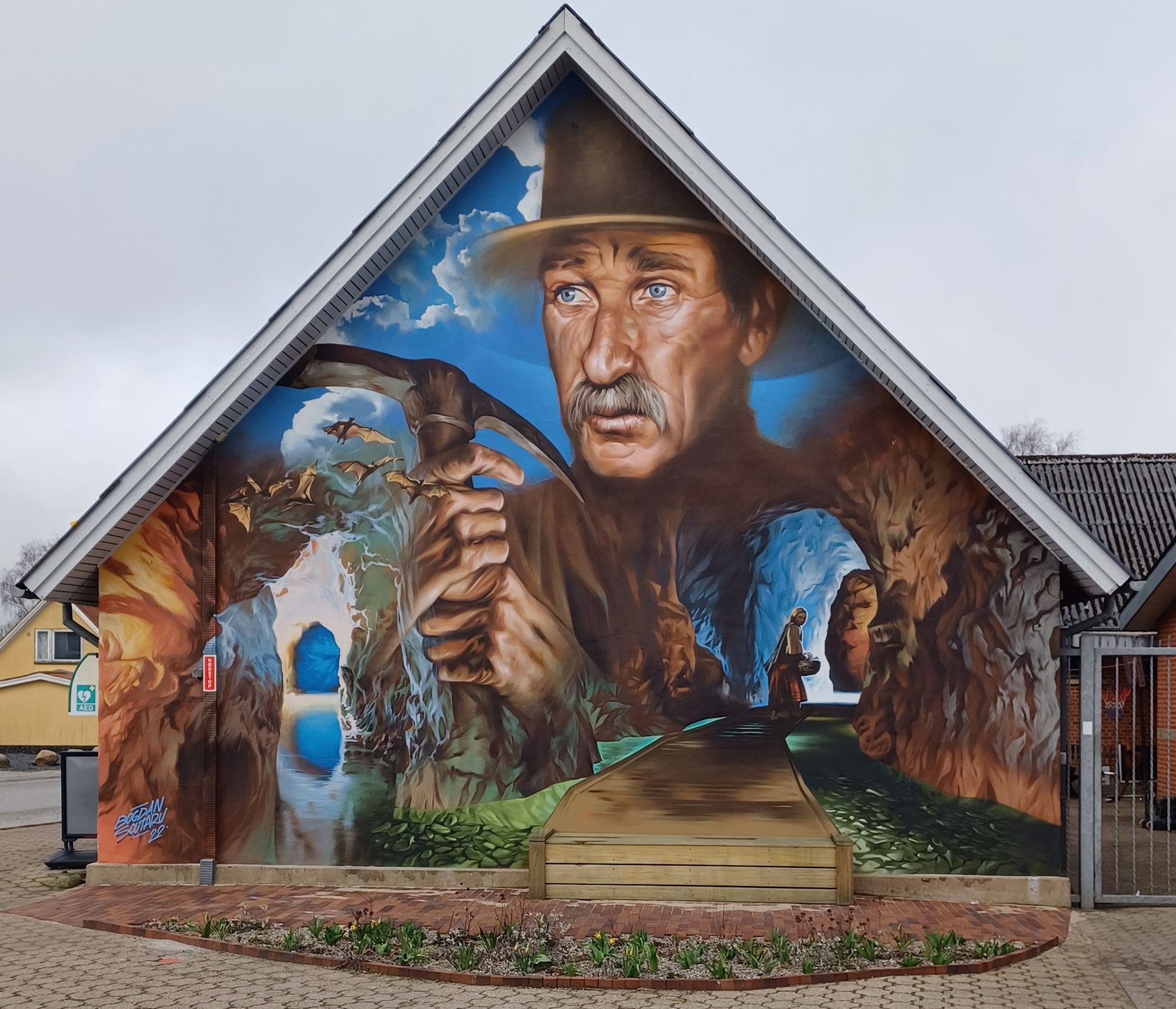 - Daglig brugsens endegavl, hvor der er malet et kunstportræt af kalkgruberne.