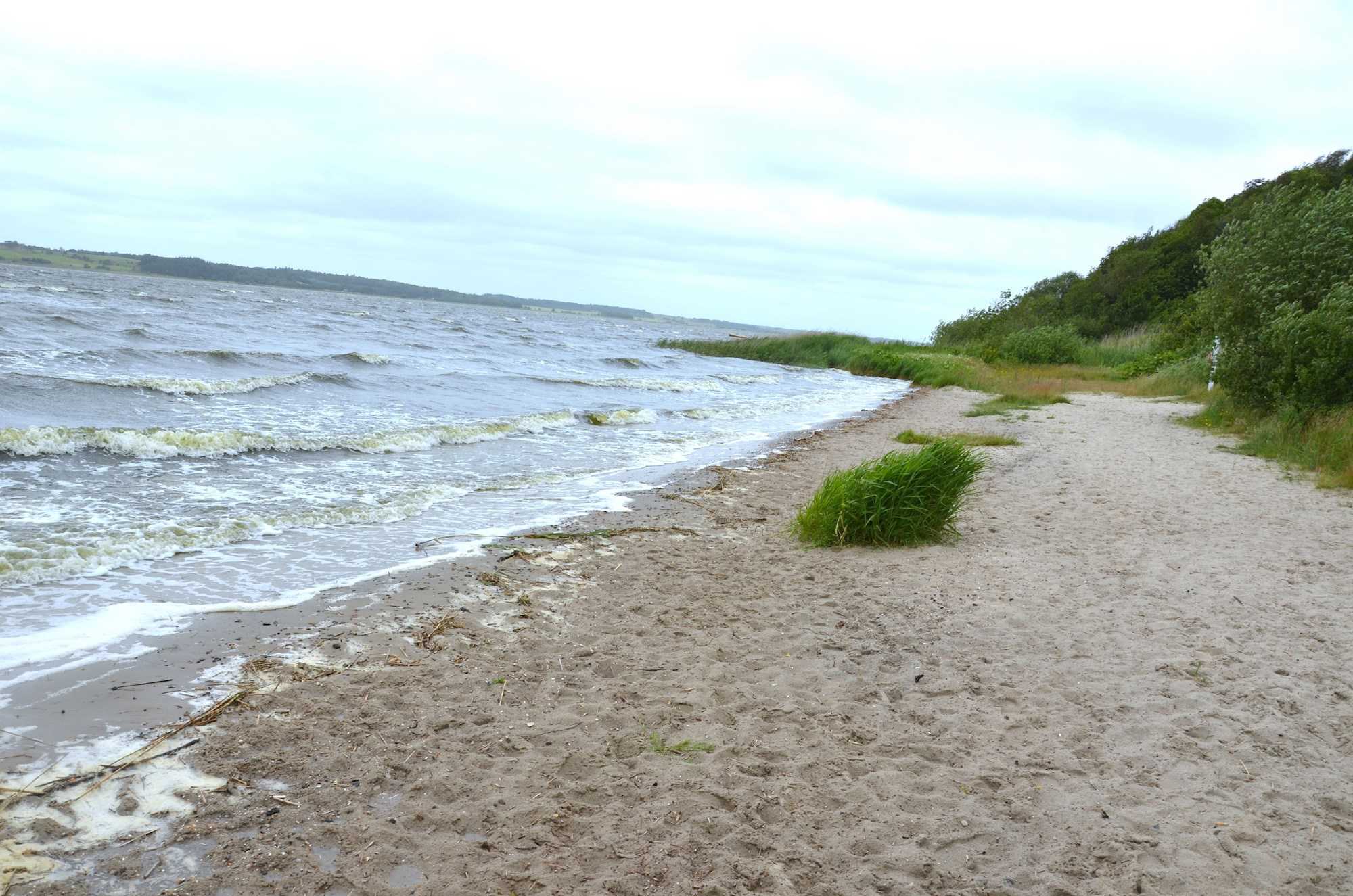 - Smal strand, hvor der er lavvandet, og der i perioder med pålandsvind kan være meget tang.
